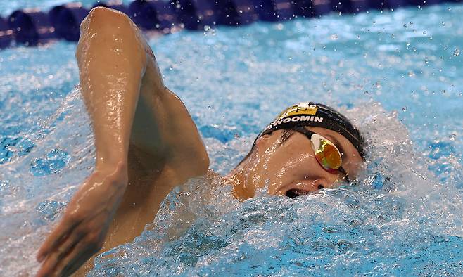 | 2연패 담금질 남자 수영 국가대표 김우민이 지난 8일 충북 진천선수촌 수영센터에서 2025 싱가포르 세계수영선수권을 대비해 훈련을 하고 있다. 진천=뉴시스 |