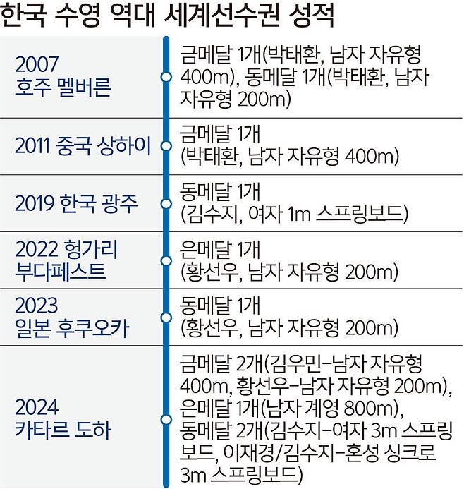 한국은 지난해 도하에서 금메달 2개, 은메달 1개, 동메달 2개를 수확하며 세계수영선수권 역사상 최고의 성적을 거뒀다. 황선우가 남자 자유형 200m, 김우민이 남자 자유형 400m에서 금메달을 따냈다. 올림픽 전초전 성격의 대회에서 거둔 수확이라 2024 파리올림픽 당시 수영 종목에서도 기대감이 높았지만 자유형 400m 동메달 1개(김우민)에 그치며 세계의 높은 벽을 실감했다. 그만큼 이번 싱가포르 대회는 한국 수영의 진짜 경쟁력을 판가름할 무대다.