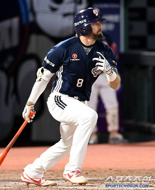 10일 부산 사직야구장에서 열린 두산과 롯데의 경기, 7회초 2사 2루 두산 케이브가 1타점 적시타를 치고 있다. 부산=허상욱 기자wook@sportschosun.com/2025.07.10/