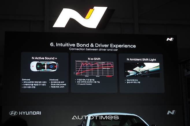 이 자리에서 김주원 N사업전략팀 팀장은 "상상력과 용기로 N은 끊임없이 한계에 도전해 나갈 것"이라며 "우리는 단순 수치가 아니라 전기차 운전이 얼마나 즐거울수 있는지 보여주는 것이 목표"라고 차를 설명했다.