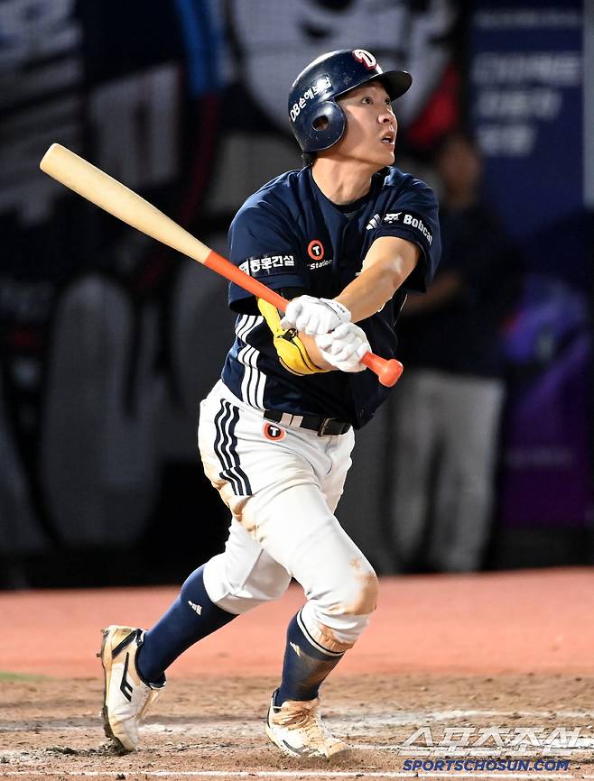 10일 부산 사직야구장에서 열린 두산과 롯데의 경기, 9회초 두산 정수빈이 솔로홈런을 치고 있다. 부산=허상욱 기자wook@sportschosun.com/2025.07.10/