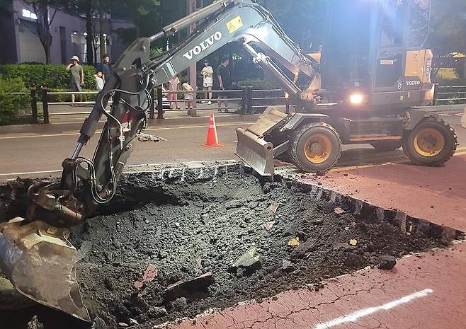 땅 꺼짐으로 인한 인명피해는 없었으나 경찰은 왕복 5차선 도로 중 3차선을 통제하고 안전 조치를 했다. 2025.7.10 [인천시 연수구 제공. 재판매 및 DB 금지]
