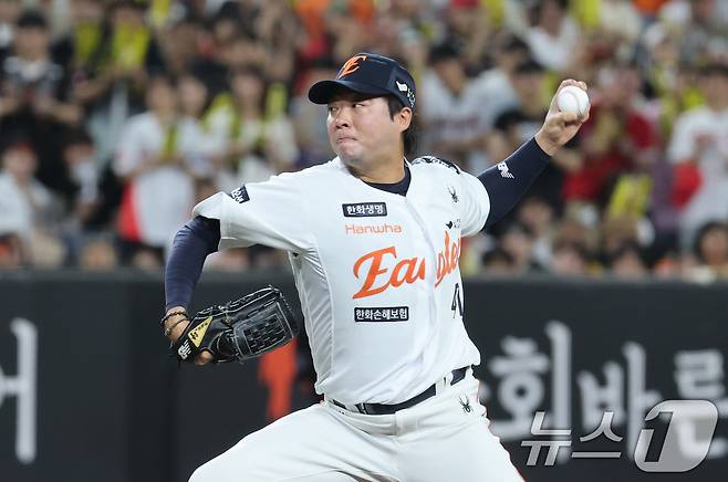 (대전=뉴스1) 김기태 기자 = 10일 오후 대전 한화생명 볼파크에서 열린 프로야구 '2025 신한 SOL뱅크 KBO 리그' 기아 타이거즈와 한화 이글스 경기에서 한화 투수 김범수가 역투하고 있다. 2025.7.10/뉴스1