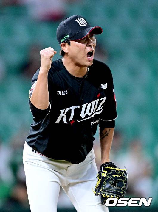 8회말 1사 주자없는 상황 SSG 고명준을 내야 땅볼로 이끈 KT 투수 우규민이 2루수 김상수의 좋은 수비에 기뻐하고 있다. 2025.07.10 / dreamer@osen.co.kr