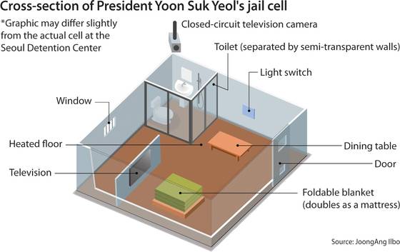 Yoon is being held in a solitary cell previously used by a single inmate. Due to severe overcrowding, authorities were unable to place him in the larger room typically used for former presidents and assigned him to a smaller cell instead.
