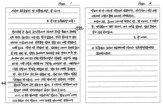 | ▲ 조국 전 대표가 최홍엽 광주환경운동연합 공동의장을 추모하며 보낸 옥중 서신. |