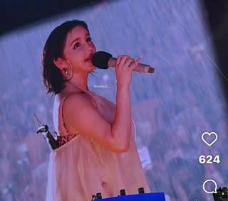 사진 속 박봄은 무대 위에서 물을 맞은 채 노래를 부르고 있으며, 감정을 쏟아내는 듯한 표정으로 마이크를 쥐고 있는 모습이 인상적이다.