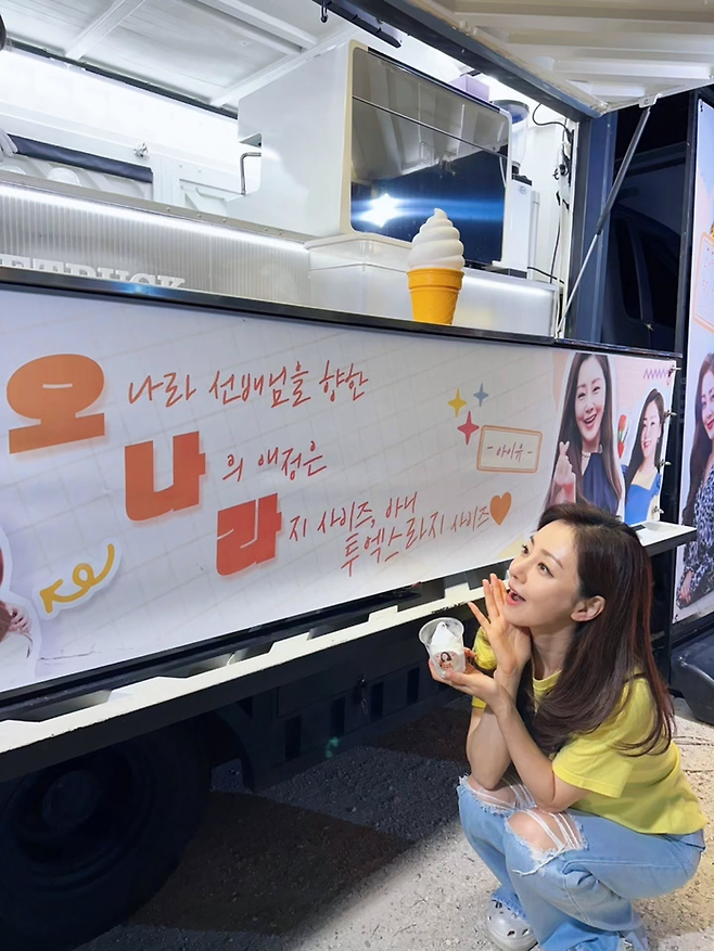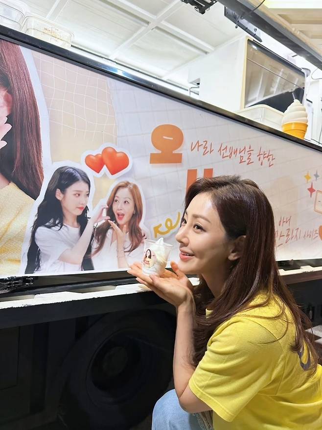 특히 푸드트럭에는 두 사람이 함께 손하트를 그리는 모습이 담긴 사진과 귀여운 일러스트, 응원 문구 등이 장식돼 현장 분위기를 더욱 밝게 만들었다. 오나라는 아이스크림을 들고 다양한 포즈를 선보이며 아이유의 선물에 대한 고마움을 드러냈다.