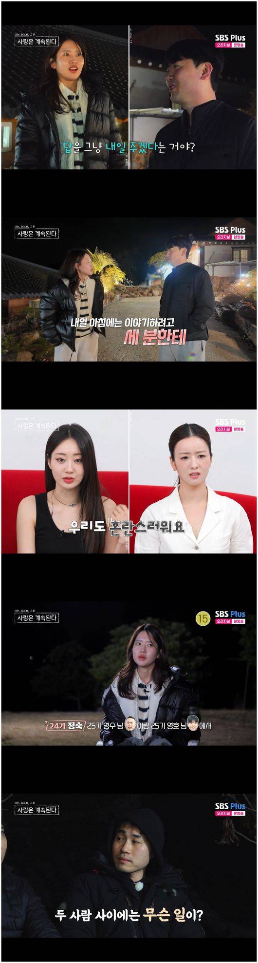 24기 정숙은 “나는 25기 영호까지 알아보고 왔다. 오빠는 마음이 어떠하냐. 영호님 여자 선택이 아니어도 대화를 하고 온 거다. 그래서 미안함은 있었다. 오빠는 날 선택해줬는데, 나는 미안했다. 아직 결론은 안 났지만, 내일 아침에 이야기를 하려고”라며 돌아와서 24기 영수에게 말했다. 영수는 “여지를 주는 거야?”라고 물었고, 정숙은 그게 아니라며 손사래를 쳤다.
