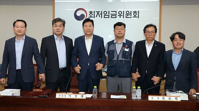 ▲ 이인재 최저임금위원장(왼쪽 두 번째)이 10일 정부세종청사에서 열린 제12차 전원회의에서 내년 최저임금을 시간당 1만 320원으로 17년 만에 합의로 결정한 뒤 공익위원-사용자위원-근로자위원과 손을 잡고 있다.