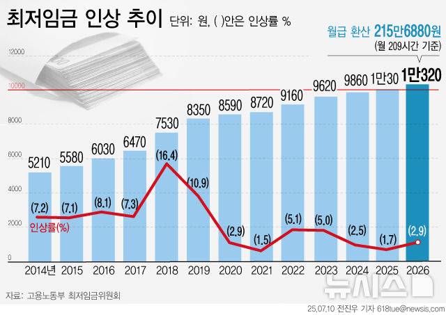 [서울=뉴시스] 10일 최저임금위원회에 따르면 내년도 최저임금이 올해(1만30원)보다 2.9% 오른 1만320원으로 결정됐다. 월 209시간 기준으로 환산하면 215만6880원이다. (그래픽=전진우 기자)