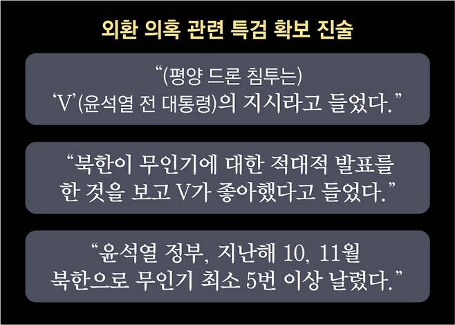 특검이 최근 현역 장교로부터 "윤석열 정부가 지난해 10월부터 11월 사이에 북한에 무인기(드론)를 최소 5번 이상 날려 보냈다고 들었다"는 진술을 확보한 것으로 알려졌다.