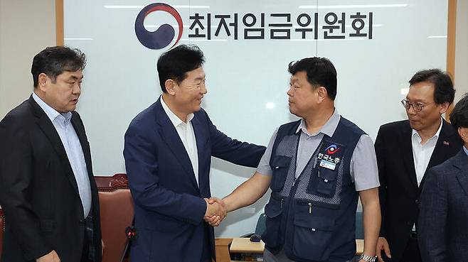 ▲ 최저임금위원회 사용자위원 운영위원인 류기정 한국경영자총협회 전무(왼쪽)와 근로자위원 운영위원인 류기섭 한국노총 사무총장이 10일 정부세종청사에서 열린 제12차 전원회의에서 내년 최저임금을 시간당 1만 320원으로 17년 만에 합의로 결정한 뒤 악수하고 있다.