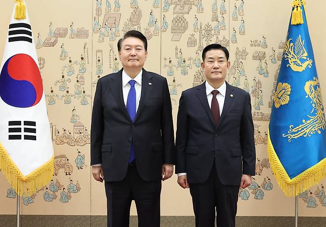 | ▲ 윤석열 대통령이 지난 2023년 10월 11일 서울 용산 대통령실 청사에서 신원식 국방부 장관에게 임명장을 수여한 뒤 기념촬영을 하고 있다. |