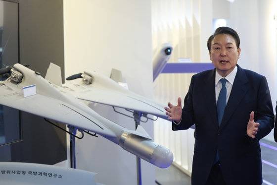 | ▲ 윤석열 대통령이 지난 2022년 12월 29일 국방과학연구소(ADD)를 방문했을 당시 '소형자폭드론' 시제품 옆에 서 있는 모습이다. |