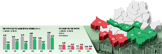 6·27 대출 규제 여파가 적은 서울 외곽 지역의 풍선효과에 대한 우려도 여전하다. 한국부동산원에 따르면 이번주 강서구 아파트값 상승률은 0.25%로 전주(0.13%) 대비 뛰었다. 관악구(0.10%→0.19%), 구로구(0.11%→0.18%), 금천구(0.08%→0.09%)도 상승폭이 확대된 건 매한가지였다. 다만 노원구(0.17%→0.13%), 도봉구(0.08%→0.05%) 등 강북권역 집값 상승폭은 축소됐다.