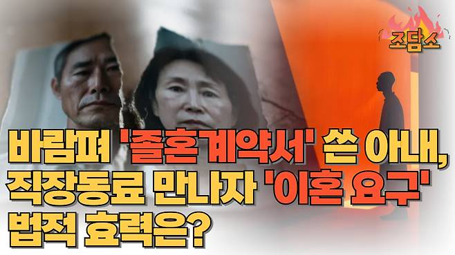 ■ 사연자 : 저는 아내와 결혼한 지 15년 정도 됐고요, 나이는 50대입니다. 부끄럽지만… 저는 직장 동료와 바람을 피웠습니다. 이 사실을 알게 된 아내는 제 직장까지 찾아와서 상대 여자의 뺨을 때렸고 직장상사에게 면담을 요청했습니다. 결국, 저는 직장 동료와 함께 근무지를 옮기게 됐고, 정직 처분까지 받는 신세가 되고 말았습니다. 그런데요, 따지고 보면 저도 무척 억울합니다. 2년 전까지만 해도, 아내와 저는 초등학생 아들 둘을 키우면서 잘 지냈습니다. 그런데 가정주부였던 아내가 화장품 판촉업체에 다니기 시작하면서부터, 집안에 불화가 찾아왔습니다. 아내는 회식을 한다며 밤늦게 들어오기 일쑤였고, 어느 날은 1박 2일로 야유회를 다녀오기도 했습니다. 그러던 어느 날 밤이었습니다. 술 취한 아내가 자는 사이, 핸드폰이 울려서 받았는데 모르는 남자였습니다. 제가 받으니까 그 남자는 놀랐는지 서둘러 전화를 끊더라고요. 이상한 예감이 들어서 아내의 핸드폰을 살펴봤죠. 그 안엔 남자 동료와 바람을 피운, 적나라한 증거들이 있었습니다. 다음 날, 저는 아내를 추궁했습니다. 그러자 아내는 저한테 정이 떨어졌다면서 '졸혼 계약서'를 쓰자고 했습니다. '이혼은 하지 않되, 서로의 사생활에는 간섭하지 말자. 가사와 육아, 생활비도 반씩 부담하자'... 이런 내용이었습니다. 아이들을 위해 가정을 유지하고 싶었던 저는… 그 계약서에 사인할 수밖에 없었습니다. 그 이후, 우리 부부는 한집에 살면서 남남처럼 지냈습니다. 그래서 제가 직장동료와 연애를 한건데, 아내가 이 사실을 알고 직장에 찾아와서 그 난리를 친 겁니다.