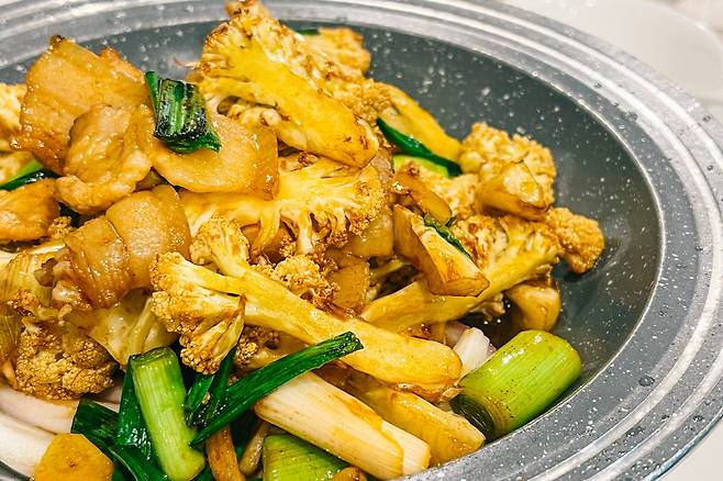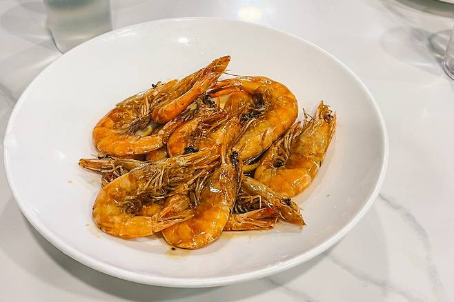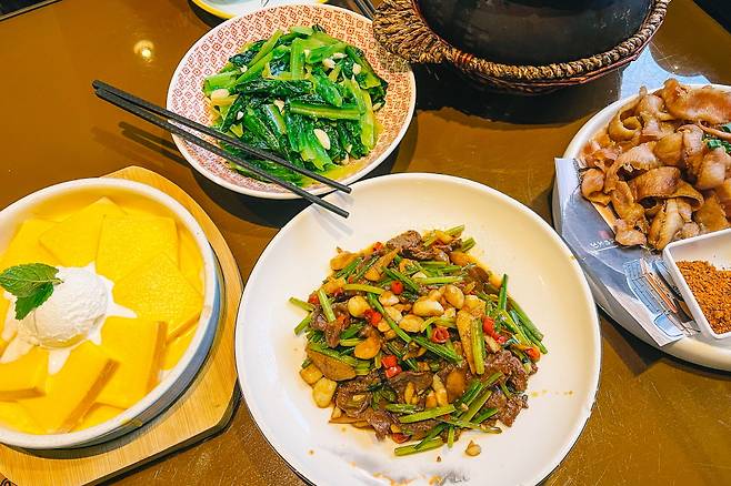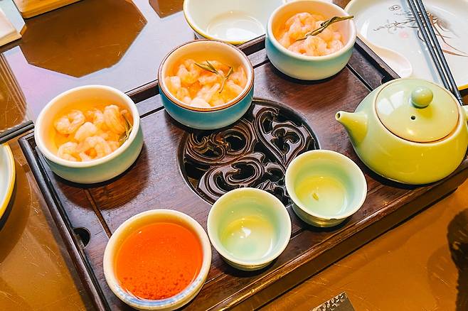 차판에 찻주전자와 찻잔, 민물새우가 정갈하게 나오는데 민물새우를 먼저 먹고 차를 마시면 된다. 각자의 풍미를 다채롭게 조합해가며 즐기는 재미가 있다. 소고기볶음이나 돼지고기구이 요리도 감칠맛이 가득해 계속 손이 간다. 전체적으로 간이 강하지 않기도 하고, 약간만 비틀어보면 한국 요리와도 비슷한 결이 있어 중식에 익숙하지 않은 사람들도 부담 없이 즐길 수 있다.