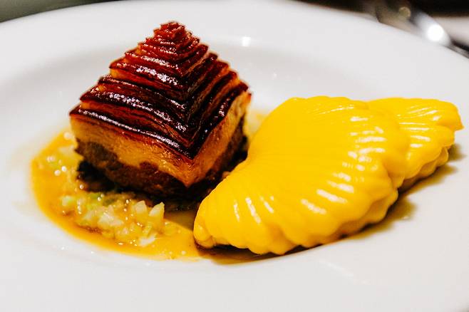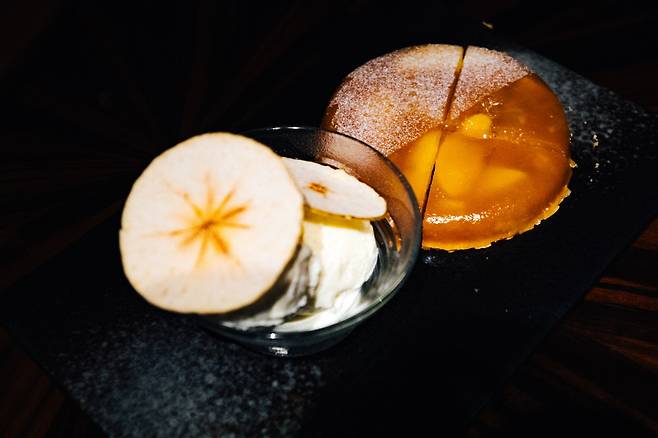 스페인산 피라 오븐의 숯과 나무 조각을 통해 강력한 화력으로 빠르게 구워내면, 그 부드러운 식감을 한층 더 살려낼 수 있다. 식사를 마친 후에는 이곳의 시그니처, 애플 타르트를 반드시 맛봐야 한다. 젤리 같은 식감과 사과의 산뜻함이 입안을 개운하게 정리해준다.