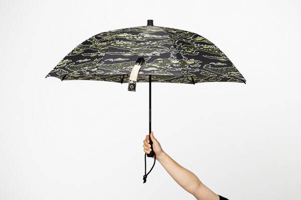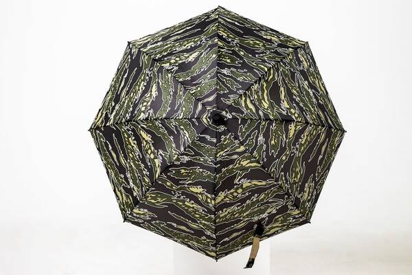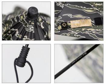 블랙, 그린, 브라운 컬러가 어우러져 디자인 된 패턴이 호랑이 줄무늬를 연상시킨다. 100% 폴리에스터에 테프론 코팅을 하여 매우 질기고 발수성이 우수하다. 우산을 접는 벨크로에 네임택이 있으며 가볍지만 잘 미끄러지지 않는 EVA 소재로 손잡이가 제작되었다.