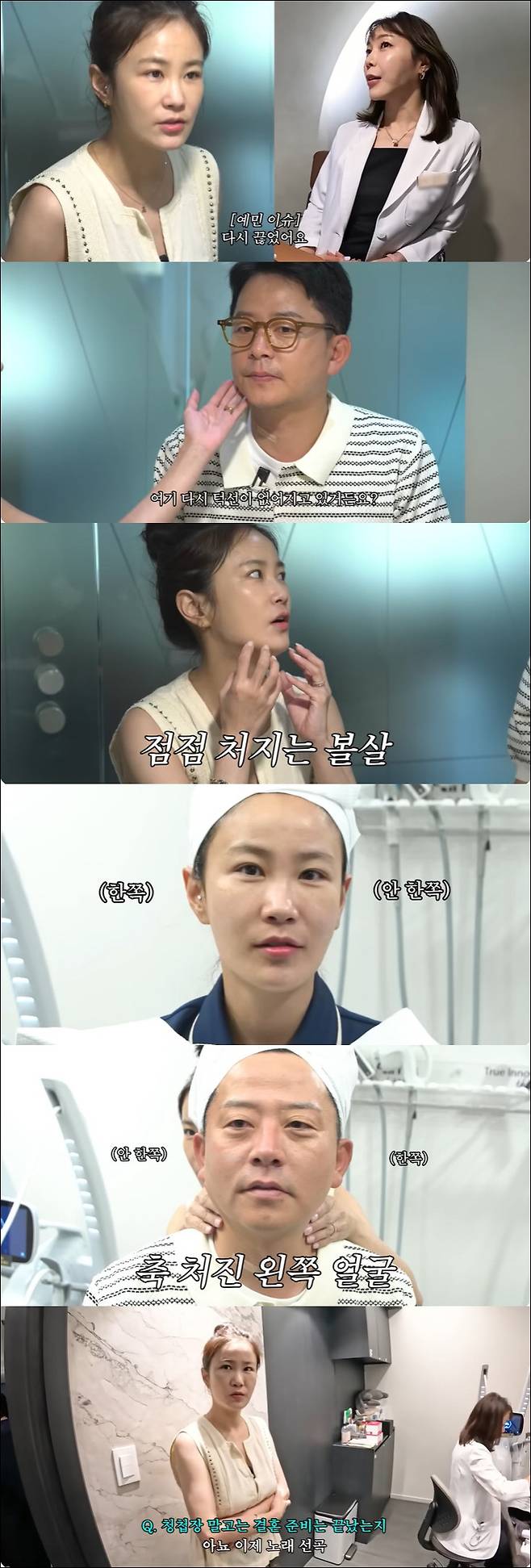 김지민은 "제 고민은 나이가 드니까 볼살이 처진다"고 토로했고 김준호는 "많이 아프냐"고 시술의 통증을 걱정했다.