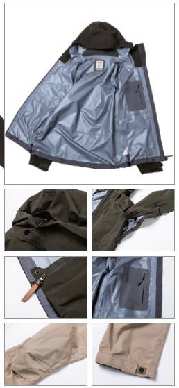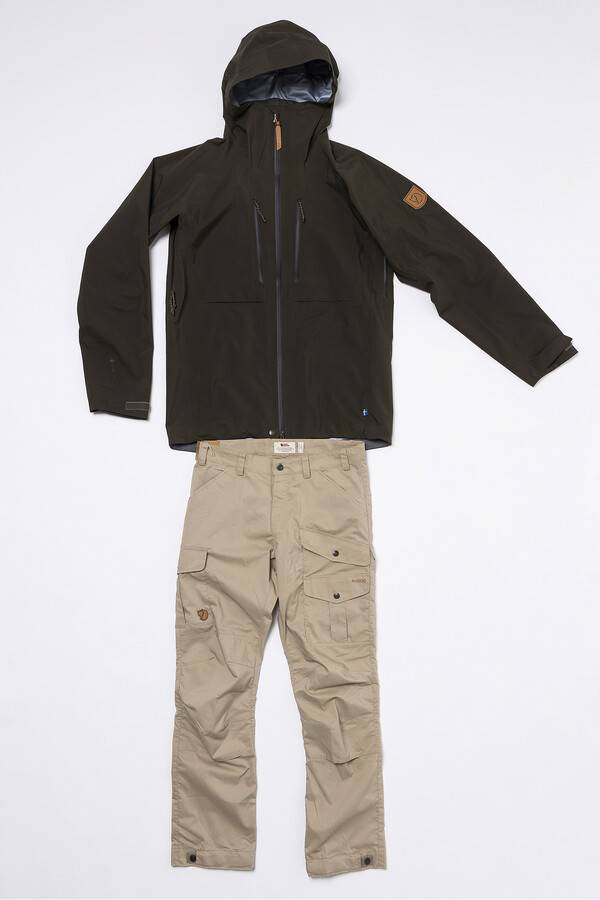 재킷이 마치 군용 같아요. 다른 제품들에 비해 무겁긴 하지만 믿음직하군요. 에코 쉘ECO-SHELL 원단이 쓰였어요. 이것도 피엘라벤이 독자 개발한 원단이에요. 환경오염 원인으로 꼽히는 PFC를 쓰지 않았군요. 발수 기능이 얼마나 좋을지 사용해 보고 싶네요. 이 바지는 표면에 그린란드 왁스가 발라져 있대요. 피엘라벤에서 만든 G-1000 왁스도 따로 팔아요. 방수성과 통기성을 사용자가 조절할 수 있겠어요!