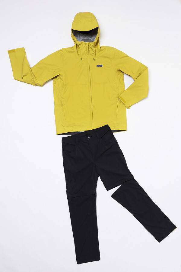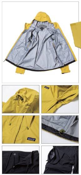 재킷은 파타고니아 고유 기술인 H2No가 적용됐어요. 이 원단이 쓰인 제품은 출시되기 전에 수만 번 세탁하는 등 테스트를 철저하게 거친다고 해요. 이 기술이 적용된 제품은 믿을 만합니다. 바지는 발수처리가 된 '방수 바지'예요. 얼핏 보면 일반 트레킹용 바지 같네요. 폐그물을 이용해 만든 바지라고 합니다.