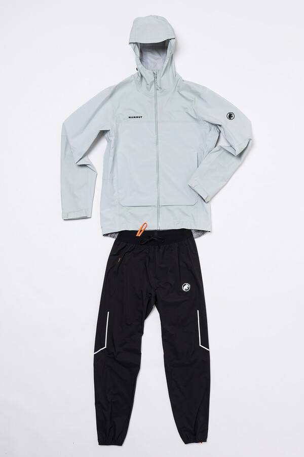 재킷 천이 두껍군요. 한여름 입기엔 더울 수도 있겠어요. '마무트 드라이 투어Mammaut DRY Tour'!로 만들었어요. 브랜드 전용 방수 천을 사용하는군요. 얼마큼 성능이 좋은지 직접 확인하긴 어렵지만 두텁고 까끌한 재질이 꽤 믿음직하군요. 바지도 상당히 좋아 보여요. 하지만 매우 얇아요. 이거 방수 기능이 있는 걸까요? 어쨌든 트레일러닝을 할 때 입으면 좋을 것 같군요.