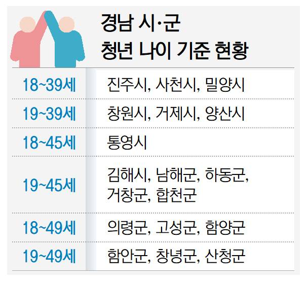 이 때문에 경남의 경우 김해·통영시와 남해·하동·거창·합천군은 45세까지, 고성·산청·의령·창녕·함안·함양군은 49세까지 주민을 청년으로 정했다. 밀양시의 경우는 청년 범주 나이를 18~39세로 유지 중이다.