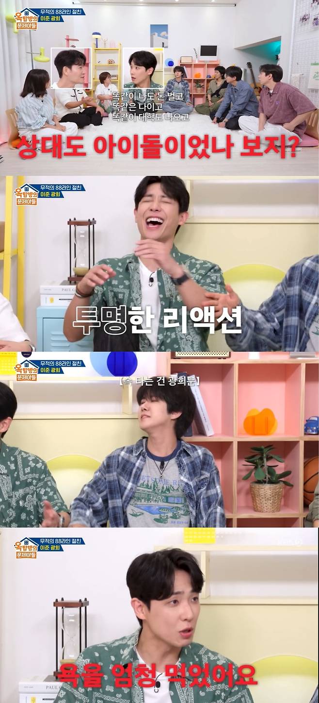 그러자 당황한 이준은 그저 웃음을 터트리며 투명한 리액션을 보였고, 옆에 앉아 있던 황광희는 "하지 마"라며 말리는 듯한 행동을 취했다.