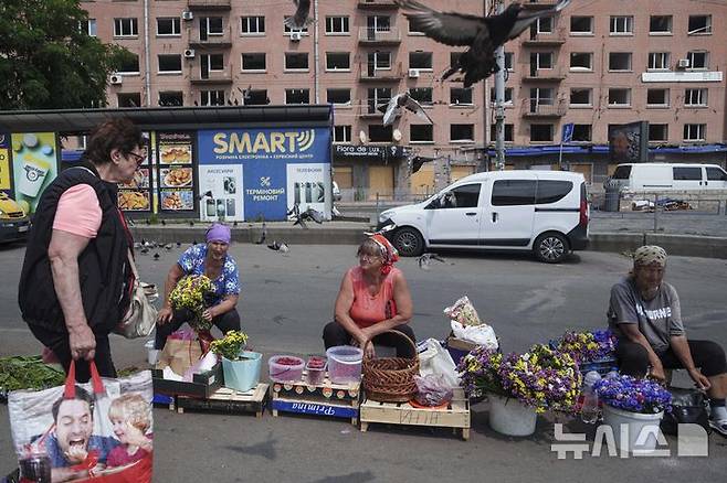 [키이우=AP/뉴시스] 10일(현지 시간) 우크라이나 키이우에서 여성들이 러시아의 공격으로 피해를 입은 건물 인근 노상에서 꽃과 라즈베리를 팔고 있다. 2025.07.11.