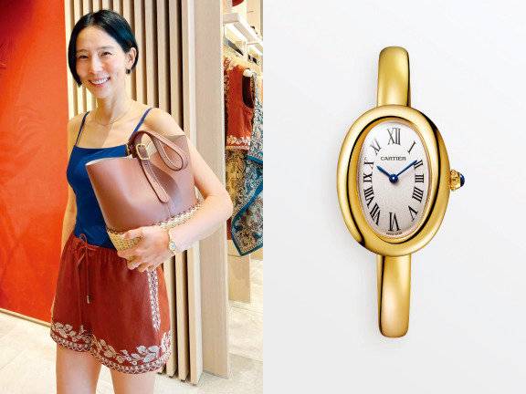 김나영의 손목 위에는 늘 한결같은 존재감을 드러내는 시계가 있다. 바로 까르띠에의 아이코닉 워치 '베누아’. 타원형 골드 케이스와 로마 숫자 인덱스, 크라운 끝의 사파이어 카보숑까지 디자인 하나하나가 클래식하면서도 우아한 분위기를 물씬 풍긴다. 특히 얇고 유려한 골드 브레이슬릿이 마치 주얼리처럼 손목을 감싸 과하지 않게 스타일을 완성해준다. 김나영은 네이비 슬리브리스 톱과 와인 컬러 쇼츠로 미니멀하게 연출한 룩에 골드 베누아를 매치해 단정하면서도 고급스러운 포인트를 더했다.