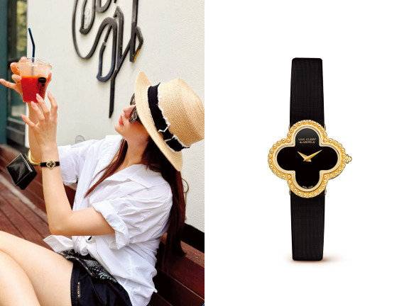 화이트 셔츠에 라피아 해트, 블랙 쇼츠로 연출한 박하선의 여름 룩에 클래식한 무드를 더한 건 반클리프아펠의 '알함브라’ 워치다. 브랜드를 대표하는 클로버 실루엣의 골드 케이스와 블랙 오닉스 다이얼, 부드러운 새틴 스트랩이 조화를 이뤄 세련된 분위기를 완성한다. 유려한 곡선과 절제된 디테일은 마치 알함브라 브레이슬릿을 착용한 듯 드레시한 느낌을 준다. 데일리 룩에 은은한 포인트를 더하고 싶을 때 제격.