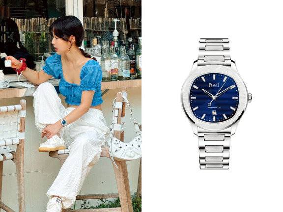 기은세는 시원한 블루 톱과 화이트 팬츠로 연출한 룩에 피아제 '폴로 데이트’ 워치를 매치해 감각적인 리조트 무드를 완성했다. 42mm의 묵직한 케이스와 청량한 블루 다이얼, 은은하게 빛나는 스틸 브레이슬릿이 어우러져 단숨에 시선을 사로잡는다. 과하지 않으면서도 또렷한 포인트가 되어 꾸민 듯 안 꾸민 듯 세련된 분위기를 연출하기에 제격! 너무 여성스럽지도, 과하게 매니시하지도 않은 중성적인 시계를 찾는다면 추천한다.