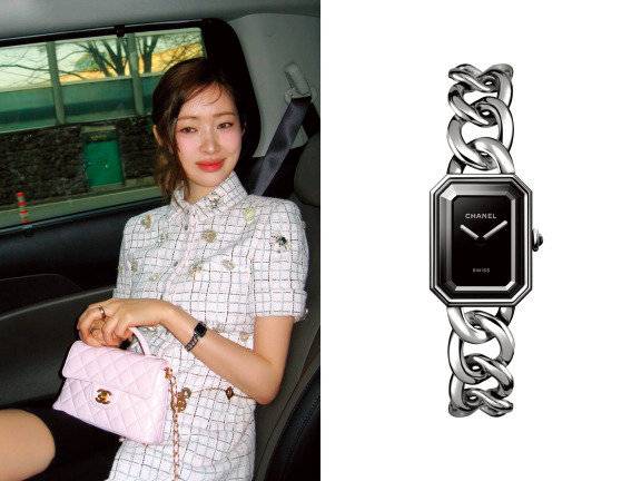 샤넬의 '프리미에르’ 워치는 세련된 여성미를 가장 간결하게 표현한 타임피스다. 차정원은 파스텔 핑크 트위드 셋업과 샤넬 미니 백에 이 시계를 착용해 브랜드 특유의 클래식 무드를 더욱 돋보이게 연출했다. N°5 향수 보틀에서 영감을 받은 팔각형 케이스와 체인 브레이슬릿이 어우러져 손목 위에 우아한 주얼리처럼 감긴다. 과하지 않은 사이즈와 슬림한 실루엣 덕분에 데일리는 물론 격식 있는 자리까지 두루두루 잘 어울린다.