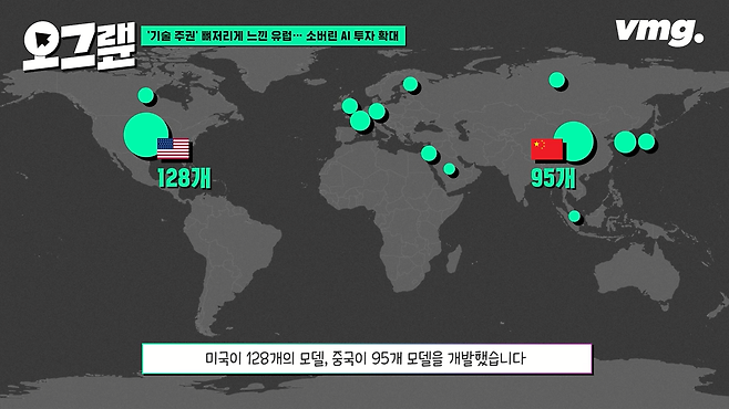 2020년부터 지난해까지 국가별로 개발한 초거대 AI 모델을 살펴보면 이렇습니다. 미국과 중국이 압도적인 1, 2위를 차지하고 있습니다. 미국이 128개의 모델, 중국이 95개 모델을 개발했어요. 그 뒤를 우리나라와 프랑스, 일본, 독일이 차지하고 있습니다. 상대적으로 순위가 낮은 유럽 주요 국가들도 늘어나는 투자와 정부의 지원에 힘입어 앞으로 규모가 더 커질 겁니다. 우리나라도 이에 뒤처지지 않게 지원하려고 하고 있고요.