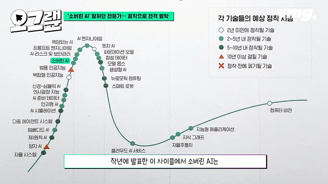 소버린 AI에 대한 사람들의 관심이 늘어나면서, 기술 혁신의 흐름을 한눈에 보여주는 가트너의 하이프 사이클에서도 그 움직임을 확인할 수 있습니다. 오그랲 첫 번째 그래프입니다.