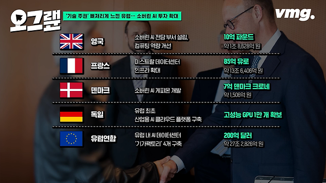 '기술 주권' 뼈저리게 느낀 유럽... 소버린 AI 투자 확대 이 사건 이후 유럽에서는 누가 먼저랄 것도 없이 소버린 AI를 개발하겠다고 발표하고 있습니다. 오그랲 네 번째 그래프는 유럽의 소버린 AI 투자 현황입니다.