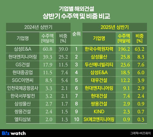 이어서는 △삼성E&A(18억4583만달러) △대우건설(12억2156만달러) △현대엔지니어링(9억5877만달러) △현대건설(7억3541만달러) △쌍용건설(2억9039만달러) △KIND(2억2528만달러) △SK에코엔지니어링(9301만달러) 순이다.