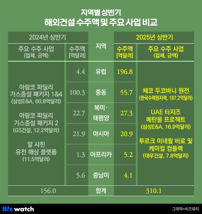 해외건설수주액의 가파른 증가는 체코 원전 계약액이 반영됐기 때문이다. 한국수력원자력(한수원)은 지난달 4일 187억2200만달러(약 26조원)의 체코 두코바니 신규원전 건설사업을 따냈다. 올해 전체 수주액의 60.4%가 체코 원전 사업에서 나온 셈이다. 지난달까지 유럽 지역에서의 올해 수주액도 196억8278만달러로 전체 수주액의 63.5%를 차지했다.