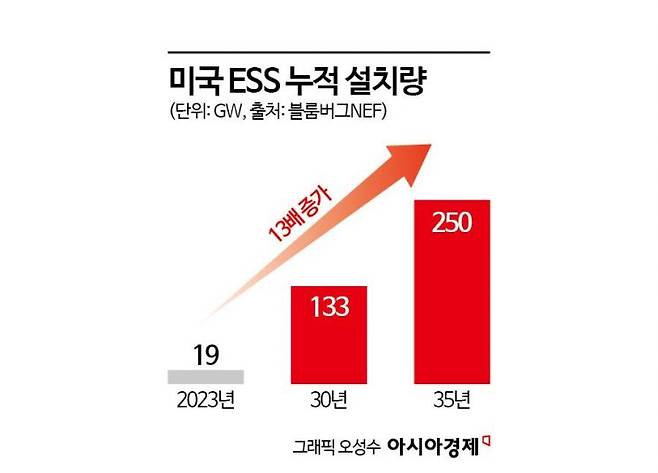 SK온이 엘앤에프와 손잡은 배경엔 급성장 중인 북미 ESS 시장이 있다. 미국에선 인공지능(AI) 데이터센터, 친환경 에너지 등 다양한 산업에서 ESS에 대한 수요가 크게 늘어나는 추세다. 산업조사기관 블룸버그NEF에 따르면 미국 내 ESS 누적 설치량은 2023년 19기가와트(GW)에서 2035년 250GW로 대폭 증가할 전망이다.