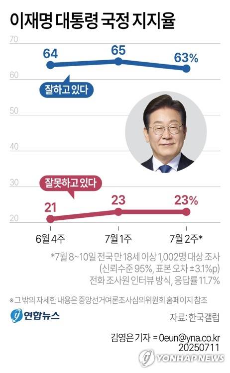 (서울=연합뉴스) 오규진 기자 = 이재명 대통령의 국정 지지율이 63%를 기록했다는 여론조사 결과가 11일 나왔다.