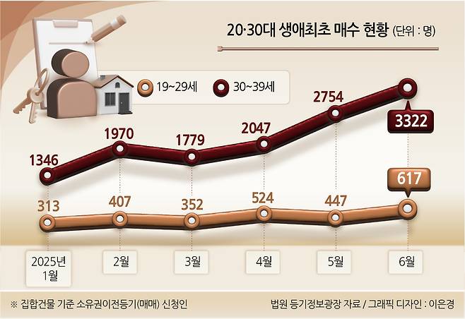매수세 이끈 것은 30대였다. 6월 생애최초 매수자 중 30대(3322명)으로 전체의 42%를 차지했다. 40대 또한 1월(630명) 대비 3배에 달하는 1897명이 지난달 첫집을 마련했다. 이 같은 분위기에 전체 서울 내 부동산(집합건물) 매수한 내국인 중 생애최초 매수자 비중 또한 1월(32.3%)에서 6월(36.5%)로 늘었다.