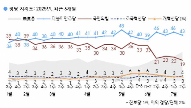 11일 공개된 한국갤럽 여론조사(8~10일 전국 18세 이상 1002명을 대상으로 전화조사원 인터뷰 방식으로 진행, 표본오차는 95% 신뢰수준에서 ±3.1%포인트, 응답률 11.7%)에 따르면 국민의힘 지지율은 지난주 조사보다 3%포인트 하락한 19%를 기록했다. 국민의힘 지지율이 20%를 밑돌기는 2020년 11월 이후 처음이다. 더불어민주당 지지율도 지난주보다 3%포인트 하락한 43%를 기록했다. 지지하는 정당이 없는 무당층 비율은 27%로, 대선 이후 가장 높아졌다.
