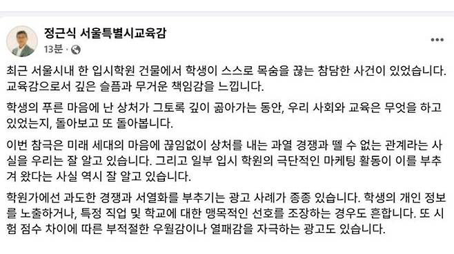 정 교육감은 "서울 시내 한 입시학원 건물에서 학생이 스스로 목숨을 끊는 참담한 사건이 있었다"며 "교육감으로서 깊은 슬픔과 무거운 책임감을 느낀다"고 심정을 밝혔습니다.