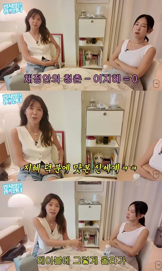 채정안은 아랑곳하지 않고 "둘이 노는데 테이블에 그렇게 올라가더라. 무대 장악하는 걸 좋아했다"며 당시를 떠올렸고, 이지혜는 "팀이 해체돼서 무대에 설 수 없으니까 테이블이라도 간 거다. 끼를 어디서 푸냐"고 얘기했다.