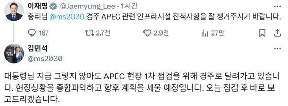 그러자 김 총리는 약 6분 후 "대통령님 지금 그렇지 않아도 APEC 현장 1차 점검을 위해 경주로 달려가고 있다"고 댓글을 달았다.