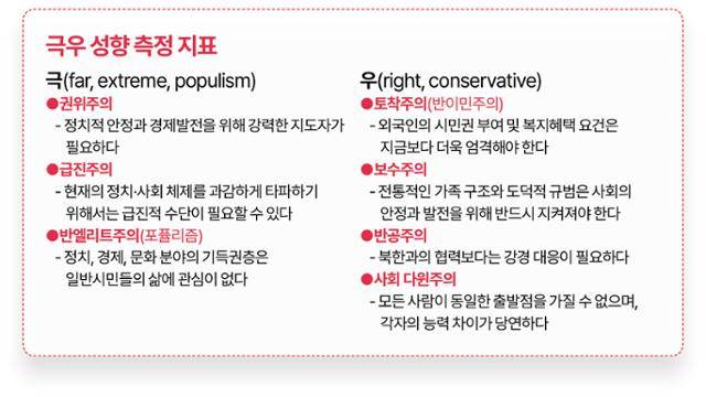 그래서 이번 연구에선 '극'으로는 권위주의, 급진주의, 반엘리트주의(포퓰리즘) 등 3가지 요소를 제시했다. '우'로는 토착주의(반이민주의), 보수주의, 반공주의, 사회다윈주의 등 4가지 요소를 제시했다. 이 7개 요소에 동의하면 극우로 분류했다.