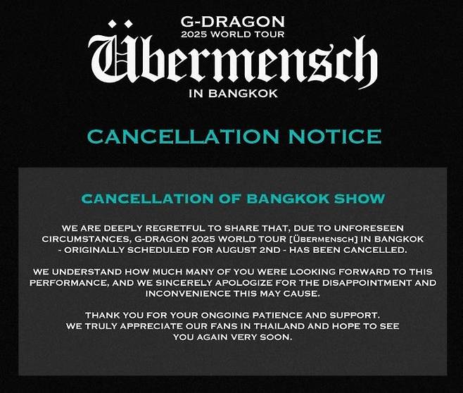 (MHN 장민수 기자) 그룹 빅뱅 멤버 지드래곤(G-DRAGON)의 태국 방콕 콘서트가 돌연 취소된 가운데, 팬들은 소속사의 태도에 불만을 표출하고 있다.