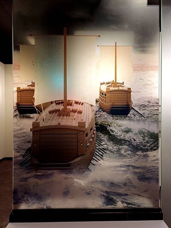 | ▲ 고금도 이순신 기념관의 조선수군 함선에 일본식 돛이 걸려 있다는 주장이 나온다. 주무부서는 충남 아산 현충사에서 그대로 가져온 이미지라고 전했다. |